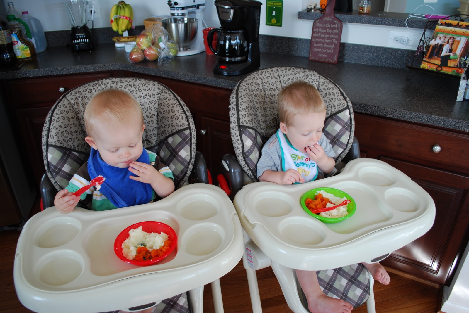 I'm a little embarrassed to be posting this, but I've been very lazy when it comes to letting the boys practice with spoons. It's been so much easier to just feed them or let them eat with their fingers, it's faster, neater, etc. But, I know they need to start. So, I've been giving the boys their spoons and letting them feed themselves. I've been working with them in the mornings helping them use a spoon to eat their oatmeal and now I'm trying to feed them things for lunch that require a spoon. I usually give them a grilled cheese, quesadilla, hot dog, sandwhich fixin's, etc, but I made some mashed potatoes for them just so they could practice using their spoon. I don't think Carter really liked the mashed potatoes. He doesn't seem to really love mashed potatoes or macaroni and cheese (clearly, he doesn't take after his mama). But, both the boys did pretty good.