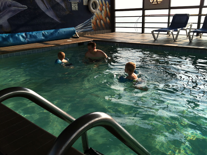We took one last dip in the pool before going back to the room to shower and pack up. The boys had never been in a pool before this (except for our blow up kids pool at home) and did great. They LOVED it. We held on to them every second the first day and the second day they had figured out the puddle jumpers and wanted us to let go. By the last day, they were swimming to things they wanted to get to and didn't want us to help them at all. They were naturals. I finally felt ok getting a couple of pictures while Greg was in the pool alone with the two of them.