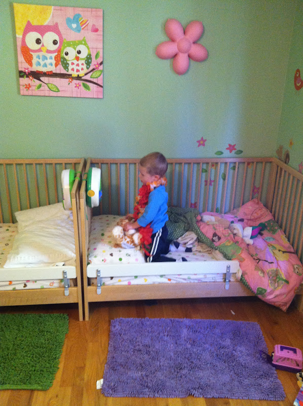Yes, Evan is wearing a lei in this picture. He insisted on wearing it to the play date. :) The boys went into the bedroom and was loving the big kid beds and the music makers hanging on the cribs. They played with those forever.