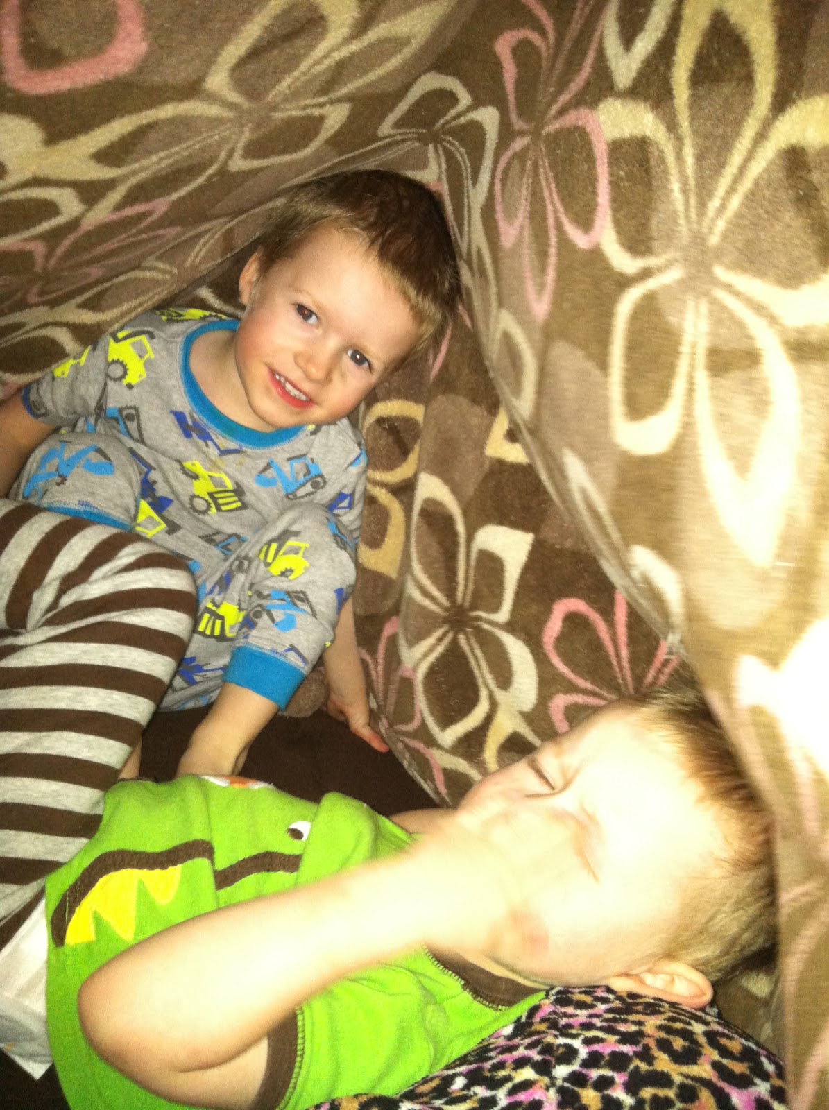 another view of this great fort. The boys had a great time at our play date and I've learned that I'm definitely going to have to step it up in the fort making department. ;)